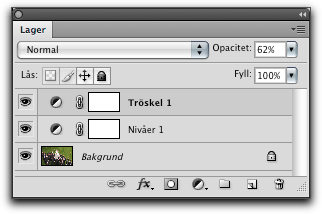 Det finns många metoder att kontrollera att de ljusasta valörerna har en tillräcklig ton för att de ska kunna tryckas. Den kanske enklaste är att använda sig av ett justeringslager av typen Tröskelvärde. Ställ in det gränsvärde du valt. Alla valörer som nu återges i vitt kommer att bli helt utfrätt vita i det färdiga trycket. Genom att dra ner opaciteten på lagret kan du se bilden under.