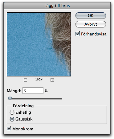 Om det inte är möjligt kan man lägga ett försiktigt brus (Filter > Brus > Lägg till brus) på bilden. Bruset bryter upp jämnheten i tonfördelningen och döljer på så sätt posteriseringen.